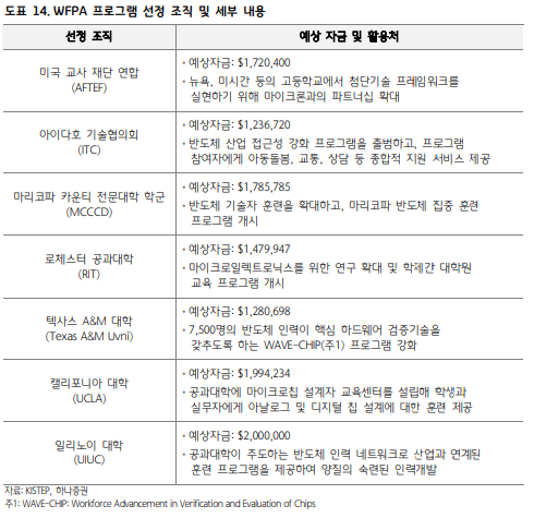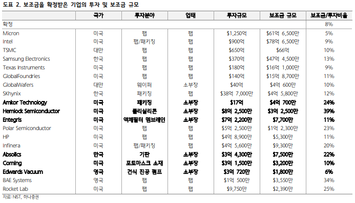 - 미국: 첨단 로직, 패키징, 원자재 생산 등 영역에서 Intel, TSMC, Micron, 삼성전자 등 글로벌 기업들이 수혜를 받고 있다.