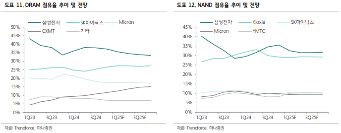 - 메모리 분야에서는 CXMT, YMTC 등이 DRAM과 NAND에서 점유율 10% 이상을 확보하고 있다.