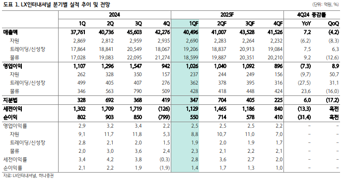 LX인터내셔널은 2025년 1분기 실적이 시장 기대에 부합할 것으로 예상되며, 주요 자원 가격과 물류 운임이 약세를 보였음에도 불구하고 실적 타격은 제한적일 전망입니다. 특히 배당 수익 측면에서의 안정성이 투자자 주목 포인트입니다.