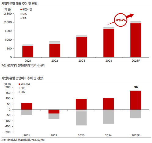 2025년 위성 시스템 부문 매출은 1,950억 원(+20.6%), 영업이익률은 8.7%까지 상승 전망됩니다.