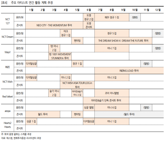 2분기부터는 NCT Wish, RIIZE, aespa 등 중저연차 아티스트 컴백이 본격화되며 실적이 더욱 확대될 전망입니다. RIIZE는 월드투어에 돌입하고, aespa의 투어도 한층 확대될 계획입니다.