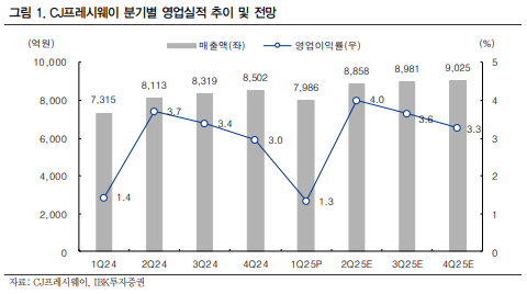 CJ프레시웨이는 2025년 1분기 연결 기준 매출액 7,986억 원(+9.2% YoY), 영업이익 106억 원(+1.0% YoY)을 기록하며 당초 기대치에 부합했습니다.