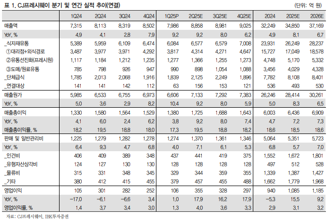 CJ프레시웨이는 2025년 1분기 연결 기준 매출액 7,986억 원(+9.2% YoY), 영업이익 106억 원(+1.0% YoY)을 기록하며 당초 기대치에 부합했습니다.
