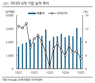 - 6개 주요 미디어 기업의 합산 실적: 매출액 2.4조 원(-0.4% YoY), 영업이익 743억 원(-23% YoY, 영업이익률 3.1%)