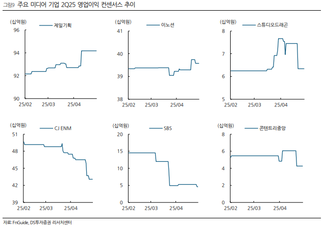 2분기에도 국내 광고 회복 지연 및 드라마 제작 물량 집중 현상으로 인해 업종 전체 실적은 부진할 것으로 전망됩니다.