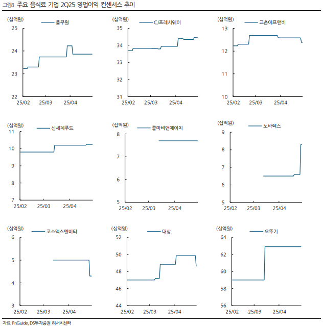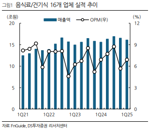 2025 1분기 음식료 업종은 매출액 16.1조 원(+3% YoY), 영업이익 1.1조 원(+3% YoY)을 기록했습니다. 이는 시장 기대치를 밑도는 수준입니다.