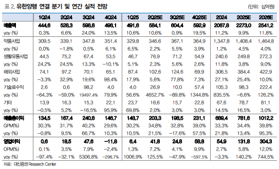 유한양행은 2025년 2분기에 연결 매출 5,841억 원(+10.6% YoY), 영업이익 418억 원(+125.5% YoY)을 기록할 것으로 전망됩니다. 영업이익 개선의 핵심 요인은 라즈클루즈 일본 출시 마일스톤(약 207억 원)과 러닝로열티(약 62억 원)의 반영입니다. 약품, 생활유통, 해외사업부 모두 전년 대비 안정적 성장을 보였으며, 기술료 수익은 전년 동기 대비 무려 +4,652.7% 증가했습니다.