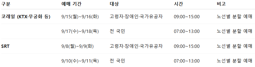 - 코레일: 교통약자 9/24 자정, 일반 예매 9/21 자정