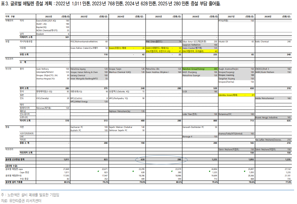 - 에틸렌 증설 둔화 → 수급 개선 기대