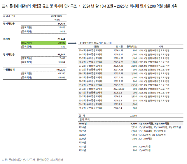롯데케미칼은 2024년 말 기준 순차입금 6.9조 원으로 부채 부담이 컸지만, 2025년에는 총 9,200억 원의 회사채를 상환할 계획입니다.